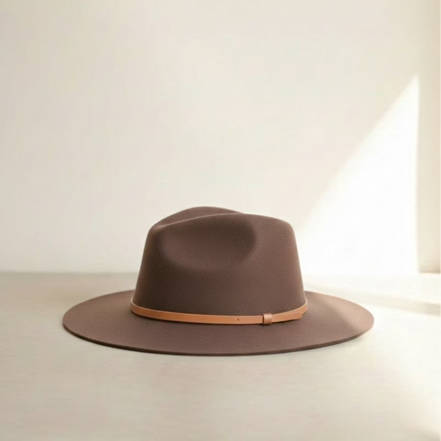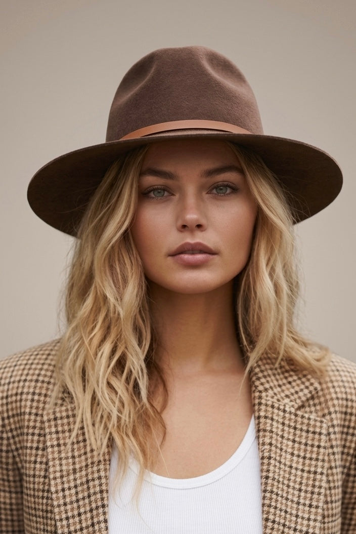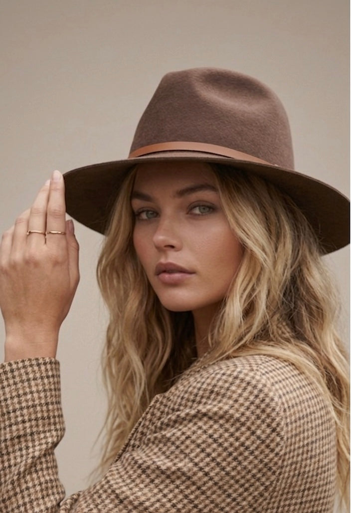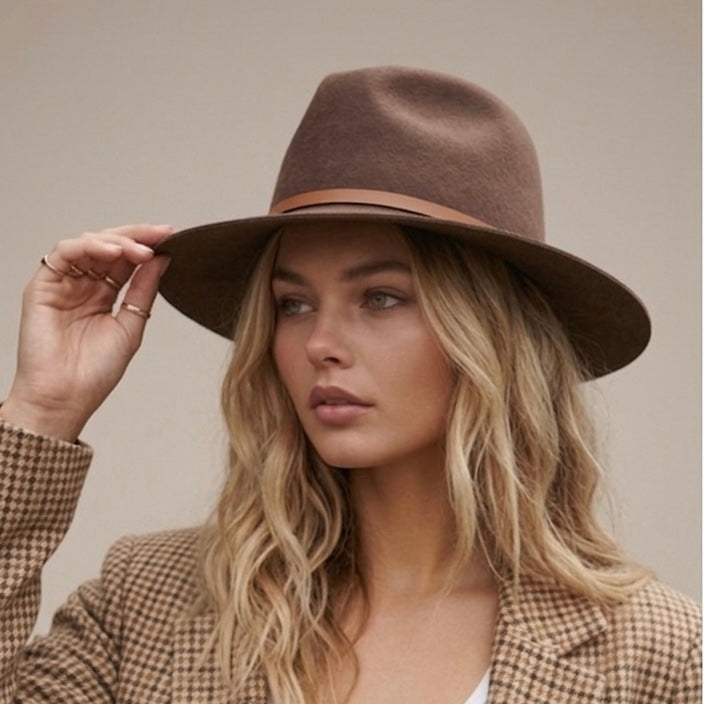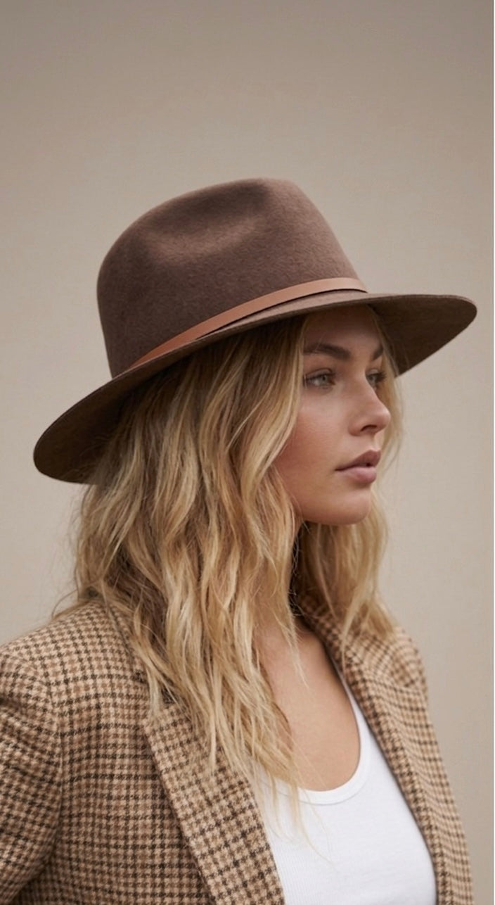 In a natural olive-green hue paired with a contrasting tan leather band- this slightly shorter brim of 6.5cm, Cruz is a good option for those who want something more understated.