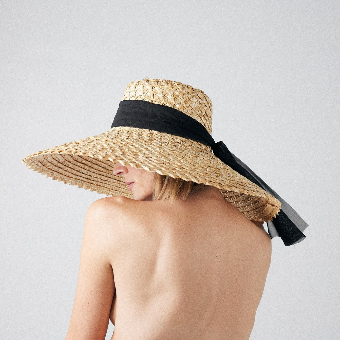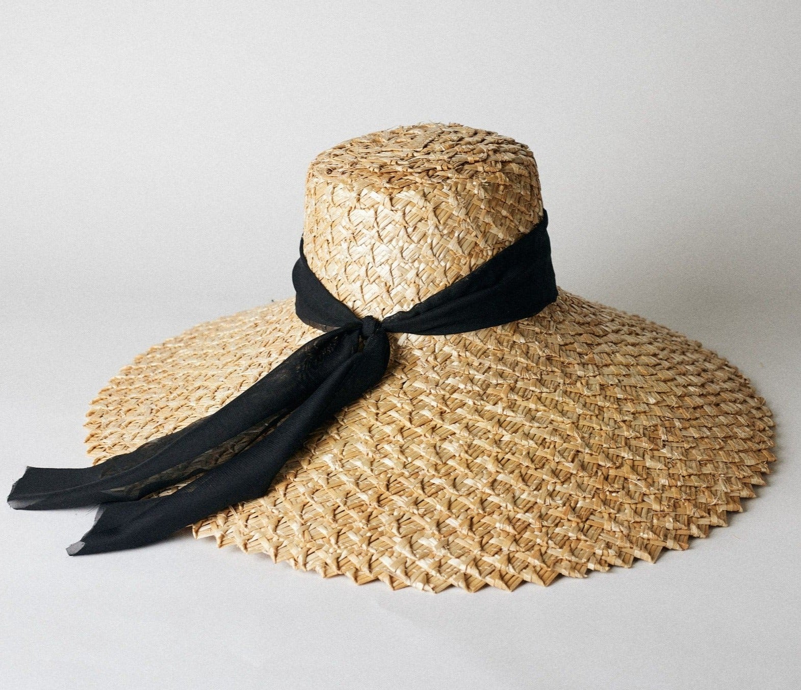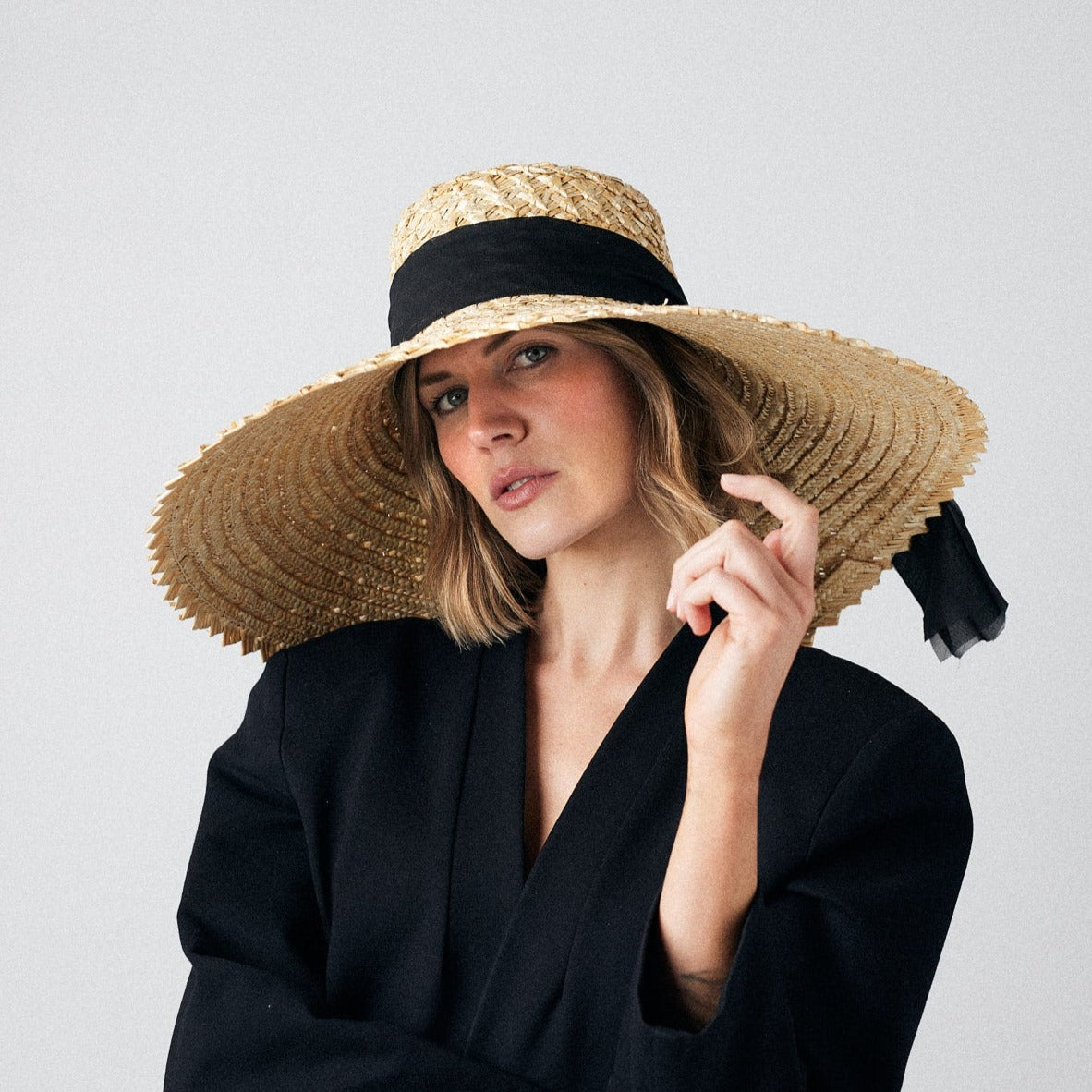The stunning wide brimmed hat made from woven straw are then highlighted by the statement black ribbon tied in an elegant bow at the back of the hat. This hat is the true epitome of elegance and will make your next resort holiday attire the most stylish yet.
