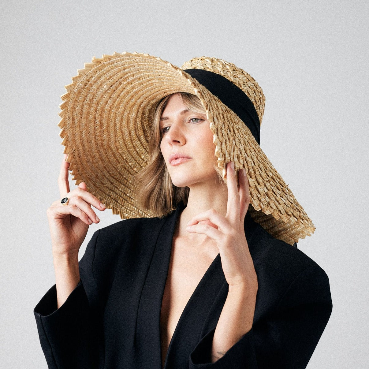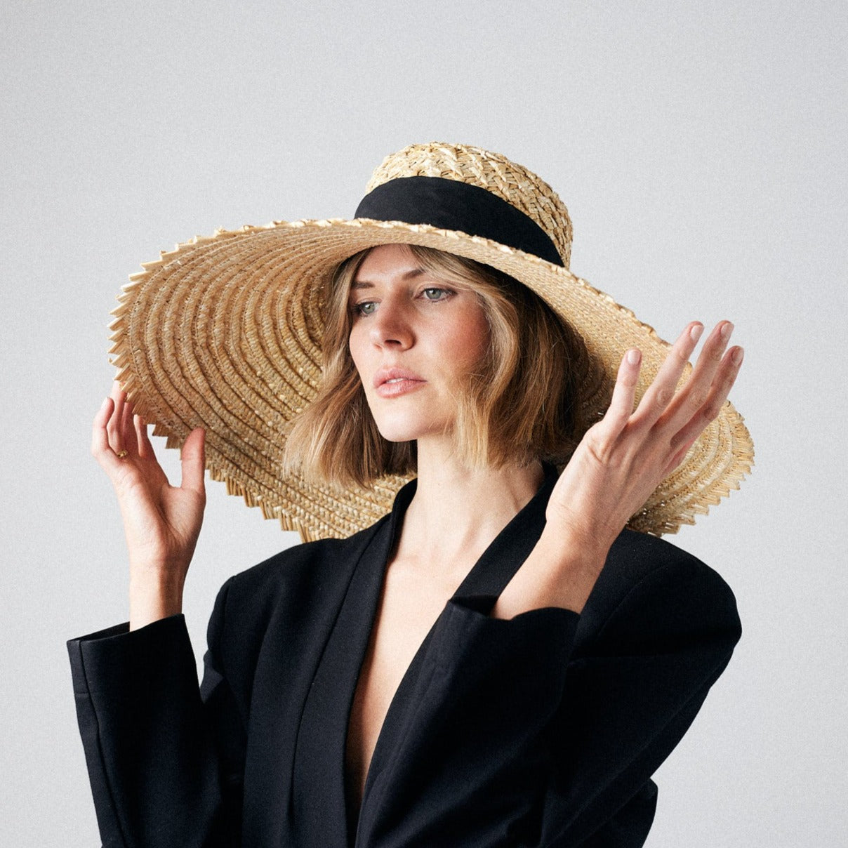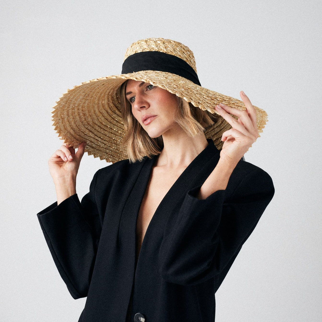 The stunning wide brimmed hat made from woven straw are then highlighted by the statement black ribbon tied in an elegant bow at the back of the hat. This hat is the true epitome of elegance and will make your next resort holiday attire the most stylish yet.
